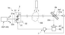 照射位置調整部3は、ガス100における光21a、22cの照射位置の制御を行う。 照射位置調整部3は、例えば、ミラー31、および駆動部32を有する。