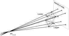 別のアプローチが図13に示され、画像は、任意に選択された焦点FP(x,y,z)から画像/画像平面に示される影の位置のコレクション(例えば、ヘキサポッドなどの既知の整形外科用構築物の基準によって形成される)に発する光線で表示されている。既知の寸法の2つの三角形(上三角と下三角)(例えば、既知の構築物の基準の位置に対応するその点)は、それぞれ3つの光線(つまり、三角形の点/コーナーごとに1つの光線)に沿って使用/位置決めされる。三角形は2つの個別のアーティクルとして示されているが、画像で5つまたは4つの影アーチファクトしか検出できない場合は、頂点またはエッジを共有できることに留意されたい。利用可能な影のアーティクルおよび任意の焦点FP(x,y,z)へのそれらの関連光線を使用して構築することができる三角形の任意の組み合わせを同様に利用できることにも留意されたい。三角形の適切な向きを決定するために、システムおよび方法は、影のアーティクルの相対的な倍率を評価して、外れ値が先行するか遅れるか(つまり、焦点FP(x,y,z)に近いか、最も近いか、遠いか、最も遠いか)を判断することができる。特定の任意の焦点について、システムおよび方法は、頂点間の既知の分離と頂点間の計算された距離との間の誤差の合計であるコスト関数を決定することができる(特定の任意の焦点FP(x,y,z))。このようなコスト関数を数値ソルバで使用して、特定の構築物に最適な互換性のあるFP(x,y,z)と、投影された幾何学的な意味でそれが落とす影を決定できる。 Another approach is shown in Fig. 13, where the image is created from a collection of shadow positions shown in the image/image plane from an arbitrarily selected focal point FP(x, y, z) (e.g., a known shape such as a hexapod). (formed by the standards of the surgical construct). Two triangles (upper and lower triangles) of known dimensions (e.g. their points corresponding to the positions of known construction fiducials) each have three rays (i.e. one ray for each point/corner of the triangle) used/positioned along the Note that although the triangles are shown as two separate articles, they can share vertices or edges if only five or four shadow artifacts can be detected in the image. Note also that any combination of triangles that can be constructed using the available shadow articles and their associated rays to any focal point FP(x,y,z) can be utilized as well. To determine the appropriate orientation of the triangle, the system and method evaluates the relative magnification of the shadow article to determine whether the outlier is leading or lagging (i.e., in focus FP(x,y,z)). (closest, closest, farthest, farthest). For any particular focus, the system and method can determine a cost function that is the sum of the errors between the known separation between the vertices and the calculated distance between the vertices (for any particular focus FP (x, y, z)). Such a cost function can be used in a numerical solver to determine the optimal compatible FP(x,y,z) for a particular construct and the shadow it casts in a projected geometric sense.