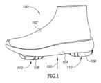 ここで、本発明のいくつかの実施形態による、歩行/姿勢の固有受容性および運動感覚性訓練のための矯正履物の簡略化された斜視図である図1と、矯正履物の靴型によって反映される矯正履物のVOTfの簡略化された斜視図である図2とを参照する。図1に示されるように、矯正履物100は、バンプ102およびソール104、ならびに矯正履物100のアウトソール302(図3)に結合された2つの隆起106および108を含む。いくつかの実施形態では、隆起106および108の各々は、表面(例えば、床)を有する隆起の接触点(POC)110を含む。いくつかの実施形態では、隆起106および108の各々は、表面(例えば、床)との隆起の接触面を画定する接触点のクラスタを含む。これは、例えば、ユーザーの体重によって加えられる圧力下での隆起の変形時に、変形可能な隆起において発生し得る。しかしながら、説明を簡略化するために、この時点から、単一の接触点(POC)110のみを参照する。いくつかの実施形態では、バンプ102およびソール104のインソール部分は、図2に示される履物の治療体積(VOTf)を靴型200によって画定する。 1, which is a simplified perspective view of corrective footwear for gait/postural proprioceptive and kinesthetic training, and reflected by the last of the corrective footwear, according to some embodiments of the present invention. Please refer to FIG. 2, which is a simplified perspective view of the VOTf of orthotic footwear worn. As shown in FIG. 1,