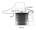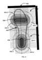 図5Aおよび5Bは、集合的に図5と呼ばれ、本発明のいくつかの実施形態による、有効な治療ゾーンのグラフィック表現である。有効な治療ゾーンは、有効な歩行/姿勢の固有受容性および運動感覚性訓練を実現するために、足(例えば、足の裏)から脳、より具体的には小脳への感覚入力を生成する有効な乱れを生成する、隆起POCを配置する必要がある領域を画定する。図5Aは、図4の主隆起変換ゾーン408によって表されるように、直下に配置された隆起(例えば、図1、隆起108)による矯正履物のVOTf(例えば、図2、VOTf3)の後方部分についての有効な治療ゾーンを表す。図5Bは、図4の主隆起変換ゾーン406によって表されるように、直下に配置された隆起(例えば、図1、隆起106)による矯正履物のVOTf(例えば、図2、VOTf1および/またはVOTf2)の前方部分についての有効な治療ゾーンを表す。 Figures 5A and 5B, collectively referred to as Figure 5, are graphical representations of effective treatment zones, according to some embodiments of the present invention. Effective therapeutic zones generate sensory input from the feet (e.g. soles) to the brain, more specifically the cerebellum, to achieve effective gait/postural proprioceptive and kinesthetic training Define areas where raised POCs need to be placed that produce effective perturbation. FIG. 5A illustrates a posterior portion of a corrective footwear VOTf (eg, FIG. 2, VOTf3) with an underlying ridge (eg, FIG. 1, ridge 108) as represented by primary