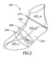 履物は、多くの要素から一般的に構成されるが、説明を明確にする目的で、本開示では、ソールおよびバンプを備える履物を参照する。隆起が結合されているソールの外側部分または表面は、本明細書ではアウトソールと呼ばれる。履物に収容された足に直接接触する、ソールの内側部分または表面は、本明細書では、インソールと呼ばれる。インソールと組み合わせた履物のバンプの内面は、履物の足収容治療体積(VOTf)を画定する。バンプは、例えば、靴を形成するために足を完全に囲み得、または例えば、サンダルを形成するために足を部分的に囲み得る。 Footwear is generally composed of many elements, but for clarity of explanation, this disclosure will refer to footwear with a sole and a vamp. The outer portion or surface of the sole to which the ridges are attached is referred to herein as the outsole. The inner portion or surface of the sole that directly contacts the foot contained in the footwear is referred to herein as the insole. The inner surface of the footwear vamp in combination with the insole defines the footwear therapeutic volume (VOTf). The vamp may completely surround the foot, for example to form a shoe, or may partially surround the foot, for example to form a sandal.
