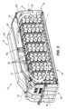 各バッテリセルアセンブリ18は、バッテリセル62のそれぞれがハウジング14の縦軸46に対して向けられるように内部空洞58内に配置される。図示の実施形態では、対応する各バッテリセル62のバッテリセル軸86は、内部空洞58内で縦軸46に直交して(すなわち、横軸50に平行に)延びる。他の実施形態では、バッテリセル軸86は縦軸46に平行に向けられてもよく、及び/又はバッテリセル軸86のいくつかが同じ方向又は異なる方向に向けられてもよい。加えて、図示の各バッテリセルアセンブリ18は、70個のバッテリセル62を備える。他の実施形態では、バッテリセルアセンブリ18は、2つ以上のバッテリセル62を備え得る。ハウジング14は、各バッテリセルアセンブリ18が所定の数のバッテリセル62の部分を有する状態で、所定の数のバッテリセルアセンブリ18を受け入れるように形状及びサイズを定められる。 Each