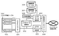 図2において、201はCATVチューナ003からのNTSCビデオ出力を入力として、MPEG2フォーマットにデジタルエンコードするビデオエンコーダ、202はビデオエンコーダから出力されるMPEG−2ストリームを蓄積するビデオデータ蓄積部、203は端末007から送信される再生、チャンネル変更、巻き戻しなどの制御信号を受信して、イントラネット002に送出するビデオストリームの制御を行うビデオストリーム制御部、204は番組のタイトルや放送日などから対応するビデオデータのIDを返すとともに、期限が切れたビデオデータや誰からも予約されていないビデオデータをビデオデータ蓄積部202の蓄積可能容量に応じてビデオデータ蓄積部202から削除するビデオデータ管理部、205はカレンダー情報と時刻を保持し、ビデオデータ管理部204からの日時参照と日数計算を受け付ける日時管理部、206はビデオデータ蓄積部202に蓄積された各ビデオデータの蓄積期限とユーザからの予約数を記憶する蓄積管理テーブル、207はビデオデータ蓄積部202に蓄積された各ビデオデータのタイトル、ジャンル、出演者、番組内容、放送日などの番組情報を記憶する番組情報テーブル、208はイントラネット002に対してデータを送受信する高速通信インタフェースである。
