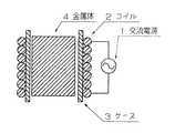 図2は、コイルとケースと発熱体の他の配置関係を参考として示す断面図である。図2のものでは、ケース(3)の内側に交流電源(1)に接続されたコイル(2)を巻き、ケース(3)外部に発熱体となる金属体(4)を設置し、コイル(2)に交流電流を流して金属体(4)を加熱し、ケース(3)外部の液体、気体を金属体(4)と直接接触させて加熱するものである。