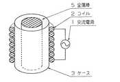 図1は、コイルとケースと発熱体の本発明例の配置関係を示す断面図である。図1のものでは、ケース(3)の外側に交流電源(1)に接続されたコイル(2)を巻き、ケース(3)内部に発熱体となる金属体(4)を設置し、コイル(2)に交流電流を流して金属体(4)を加熱し、ケース(3)内部の液体、気体を金属体(4)と直接接触させて加熱するものである。