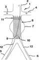 第1図に示すように、血液が透過しない微細孔の織物材料から製造され、底部領域に2つの出口開口部9,10が形成されているバッグ形状の本体がまず大動脈2の動脈瘤の領域に導入される。本体8は自己拡張可能な金属ステント11を備えており、ガイドワイヤ12上を腸骨動脈5を通して導入され、金属ステント11が動脈瘤7上の大動脈2の内側に対して少なくとも本体8の上の縁部を押すように大動脈2で展開する。本体8の底部領域において、ガイドワイヤ12は、第1図の破線に示すように、出口開口部10及び他の腸骨動脈6を通ってそれを外側に案内できるように曲がることができる。それによって、図示しないカテーテルは、本体8が血液流の作用によって拡張するまでガイドワイヤ12の各自由端を通じて導入される。ガイドワイヤ12が除去された後に、1本のガイドワイヤ13,14が各カテーテルを通して導入され、第2図に示すような展開の準備を終える。