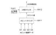 点灯時間信号発生器641は、たとえば図4のような構成をしている。すなわち、4ビットカウンタ6411と分周カウンタ6412とを有する。4ビットカウンタ6411は、データ線D1〜D4から階調データが入力されると、この値に応じて、0〜15の値(カウント数)を出力する。分周カウンタ6412には、このカウント数と、CLK1からの点灯基準クロックとが入力され、点灯基準クロックの立ち下がり回数をカウントして、入力されたカウントと同じになるまで点灯時間信号を出力する。