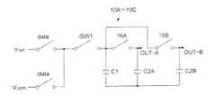前述した第1乃至第3の駆動回路において、前記基準電圧選択回路と前記入力側容量素子との間に接続された遮蔽回路をさらに備え、前記接続回路により前記入力側容量素子と前記出力側容量素子とが短絡される前に前記遮蔽回路により前記基準電圧選択回路と前記入力側容量素子とを遮断することにより前記入力側容量素子から前記基準電圧選択回路への電荷の逆流を阻止可能とすることができる。