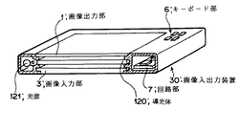 画像入出力装置30にはキーボード部6が設けられ、装置30のon・offや読み取りや表示のための各機能の選択、実行を行なえる。回路部7は装置30内に設けられ、装置30がバッテリー等の電源を有する場合はその電源を利用して駆動される画像処理部、メモリ、各機能あるいは各部を駆動制御するためのICを含む制御部を有する。