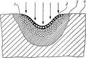 図1は組織内の治療された傷の断面図である。参照符号1はスポンジ状乾燥層を示し、部分的な死細胞(壊死)を現している。この層1は炭化層2によって被覆されている。熱変換のためスポンジ状乾燥層1の下側にコンパクトな壊死層3が形成される。この壊死層はスポンジ状層1と作用を受けていない生きた組織4との間に形成される。