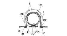 24は前記鞘管2を固定するクランプであり、ばね鋼材を素材とする帯板を鞘管2の径サイズに応じて概ねU字状に形成してある。なお、クランプ24の両端には外側に折曲した係止片25が形成され、この係止片25を前記取付板15の切欠部21から通して前記鞘管2を前記取付板15に固定する。この場合、前記取付板15の切欠部21にはクランプ24の係止片25を嵌め入れる複数の切欠凹部26,27が段差状に切り欠いて連続的に形成されている。つまり、前記送水管1及びこの送水管1を外装する鞘管2は、流水量に応じて各種のサイズのものが使用され、当然、鞘管2を固定するクランプ24も鞘管2のサイズに応じて複数種用意され、そのクランプ24を固定する切欠凹部26,27を順次間隔が広がるように段差状に切り欠いて形成することにより、サイズが異なる複数種のクランプ24を同じ取付板15に固定することができる。
