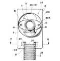 30は前記取付板15の垂直壁15Aにスポット溶接などの適宜手段で固着される筒体であり、壁板31に形成する開口孔32に嵌め入れる環状周壁部30Aと前記取付板15に突き当てる底面部30Bとを有する有底筒型に形成してある。そして、筒体30の底面部30Bに前記長孔16と同一の長孔33が穿設され、この長孔33の内周面に前記ジョイントエルボ3の取付座9と嵌合するようにほぼU字型に切り欠いた位置決め凹部34を形成している。