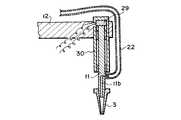 前記点着装置10の点着用ノズル11は、水平方向に延びるサンプリングアーム12の先端部を上下方向に貫通して若干昇降移動可能に支持されている。そして、図2に示すように、点着用ノズル11のフランジ部11a  がサンプリングアーム12の上面に当接可能に支持される。また、前記サンプリングアーム12の下面にはノズル上下動センサ14(フォトセンサ)が設けられ、このノズル上下動センサ14で検出するフラグ14aが点着用ノズル11の軸部に取り付けられている。