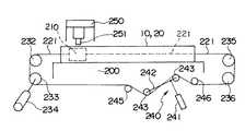 チエン221を弛めた際や、裏座210からチエン221を外した際等の場合に、スプロケットからチエン221が外れるのを防止するため、必要なスプロケットの近傍にローラがある。これらのスプロケットとローラでチエン221を挟んでいる。符号233、236はスプロケットである。符号250は摩擦攪拌接合用の回転工具251を備えた摩擦攪拌接合装置である。摩擦攪拌接合装置250は架台200を跨いでいる。摩擦攪拌接合装置250は架台200に沿って移動する。回転工具251は上下方向に移動できる。