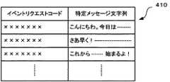 図5は、ビデオゲーム装置100において特定メッセージを登録した特定メッセージテーブル410を示す図である。特定メッセージテーブル410は、DVD/CD−ROMドライブ113によって記録媒体131から読み出され、RAM105またはHDD107に記憶される。特定メッセージテーブル410には、図5に示すように、イベントリクエストコードと特定メッセージ文字列とが対応付けて登録されている。