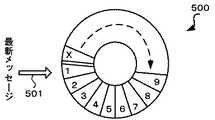 図5は、ビデオゲーム装置100のRAM105に設けられるログメッセージメモリを模式的に示す図である。このログメッセージメモリ500は、ゲームサーバ装置200から配信されたメッセージを蓄積するもので、図5に示すようなリングバッファで構成されている。蓄積されたメッセージのうちで最新のメッセージを示すポインタ501も設定されている。なお、ログメッセージメモリ500には、チャットウィンドウ350に通常時の最大行数で表示可能なもの以上のメッセージを蓄積する容量があり、図5において、「1」が最新のメッセージ、「2」が次に新しいメッセージ、そして、「X」が最も古いメッセージとなっている。