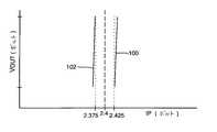図4を参照して、シミュレーション結果がこの発明の比較器10のために示される。シミュレーションの間、電圧基準VCMは2.4ボルトの定電圧に固定されており、第1および第2の電源はそれぞれ接地と5.0ボルトとに設定されていた。入力信号INも2.4ボルトに設定され、入力信号IPの電圧はVCMに対して変動させられた。図4はシミュレーションのために選択された例示的なVCMと入力電圧とにおけるヒステリシスの幅を示す。曲線100で見られるように、IPが約25ミリボルト(mV)だけINを超えると、VOUTは比較的低い電圧値から比較的高い電圧値へ(すなわち0ボルトから5ボルトへ)の遷移を始める。曲線100は、好ましい設計の結果である急速な出力スルーレートを示す急勾配の線として示される。加えて、曲線102はIPがINより僅かに低く減じられた後でさえも5ボルトのままに留まることを示す。しかしながら、一旦IPがINより25mVだけ少なくなると、VOUTは示されるように5ボルトから0ボルトへの遷移を始める。