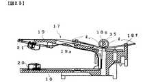 前記シャーシ10の後部にはヘッド移送機構17が配置されており、図22,23に示すように、このヘッド移送機構17はキャリッジ18と該キャリッジ18の上方にヒンジ結合されたホールドケース19とで構成されている。これらキャリッジ18とホールドケース19は共にプラスチック材で成形されており、キャリッジ18の上面には下側磁気ヘッド20が、ホールドケース19の下面には上側磁気ヘッド21がそれぞれ固定されている。