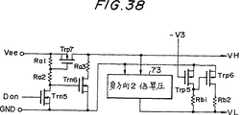 第3の背景技術として、2端子型非線形スイッチング素子を用いた液晶表示装置の電源回路について説明する。このような液晶表示装置の駆動方法は、特公平5−34655に記載されており、また、この場合に用いられる電源回路としては、特公平5−46954やUSP5,101,116に記載されたものがある。以下、図50(USP5,101,116のFig.1Aに記載される駆動電圧波形を転記)及び図51(同Fig.2Bに記載される回路を転記)を用いて、この電源回路の動作と構成を説明する。図50においてTPy(Y=1,2,…,n)はY電極を駆動する電圧波形であり、VD2は正側の選択電圧、VS2は負側の選択電圧、VM+はVD2を選択した後の非選択電圧、VM-はVS2を選択した後の非選択電圧である。VD2−VS2は約40V程度であり、ほぼ、VD2−VM+=VM-−VS2の関係が成り立つ。すなわち、VD2とVD2の中央電圧をVCとすれば、VD2とVS2はVCに対して互いにほぼ対称であり、VM+とVM-もVCに対して互いにほぼ対照である。