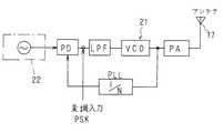 一方、本第1実施例の場合には、図2及び図3に示したように、プリント基板上に形成された水晶発振回路22を含む送信ユニット,即ち例えば、PD,LPF,VCOを含むPLLと、その出力を増幅する電力増幅器PAと、前記PD、LPFとの間に変調信号を供給しPSK変調を行う為の諸回路によって構成され、所定周波数の送信電波を発生する送信ユニット21を設け、この送信ユニット21を前記保温容器12の内部に適当する支持部材23を用いて密封処理して収容すると共に、該保温容器12内に不凍剤であるオイル24を充填してある。そして、前記保温容器12の栓体14を通して、前記内部電源バッテリィ15から電源スイッチ16を介して電源ケーブル25を前記送信ユニット21に導いて接続し、且つ同様に該栓体14を通して、前記送信ユニット21から出力する所定周波数の高周波信号を送信ケーブル26を介して、前記アンテナ装置17に導いて外部空間に放射し得るように構成したものである。なお、保温容器12内に充填するものとしては、不凍剤であるオイルの他、不凍液、オイル、更にはゾル状、ゲル状の充填物、固形の充填物(例えば、オイルに添加物を加えて固化させたもの等々)であってもよい。即ち、充填物としては、熱容量が大きいものが好ましい。