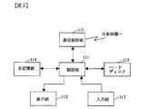 図2は、図1中の通信機能付携帯端末装置の内部構成の一例を示すブロック図である。同図中、101は制御部であり、周辺部の制御,データの要求や処理,通信などに関わる各種プログラムの実行制御を行う。102は表示部であり、例えば、LCD(Liquid  Crystal  Display)表示器および当該LCDを駆動するためのドライバなどである。また、表示部102としては、LCDに代えてCRT(CathodeRay  Tube)などを用いることもできる。103は入力部であり、例えば、表示一体型のタブレットである。104は記憶部であり、例えば、RAM,ROM,フラッシュメモリ,ハードディスクなどを使用することができる。105はメッセージ受信部であり、例えばページャである。メッセージ受信部105は、図1中の基地局130を介してホストコンピュータから送信されたメッセージを受け取る。106はメッセージを受信するためのアンテナである。107は携帯電話送受信部であり、図1中の携帯電話基地局140を介してホストコンピュータとの間のデータ通信を行う。携帯電話送受信部106は、例えば、セルラ電話やPHS(Personal  Handyphone  System)などである。108は、携帯電話送受信部のアンテナである。109は、時間を管理するためのタイマである。