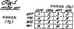 第1図は、従来のDTMF端末(プッシュボタン式電話機のプッシュボタンなどのような)からの、マトリクスをなすDTMF周波数の対が、各キーに対応している様子を示す図、
