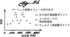 次に、信号はゴーツェル変換モジュール36に入力される。ゴーツェル変換モジュール36の機能は明細書の「背景技術」において述べた通りである。ゴーツェル変換はフーリエ変換を所定の16の周波数ポイントで行うのと等価である。周波数がこのように比較的低いので、ゴーツェル変換は高速フーリエ変換よりも正確である。第5c図はモジュール36のフーリエ変換部分の変換結果をアナログで図示した図であり、第5d図はゴーツェル変換モジュール36の出力、つまり、16の周波数に対する一群のDFT(離散フーリエ変換)振幅を示している。周波数とは、8つの公称DTMF周波数と、2つの振幅ピークの直前および直後にある4つの周波数と、4つの他のテスト周波数である。「振幅ピーク」とは、一方が低域(697Hzから941Hz)で他方が高域(1209Hzから1633Hz)のそれぞれが最も大きな振幅を持つ2つのDFTである。これが候補DTMF信号となる。低域からの信号は低域ピークとして、高域からの信号は高域ピークとして知られている。同様に、2つの候補DTMF信号、したがって候補DTMFの数字を表す2つの指数がゴーツェル変換モジュール36から出力される。