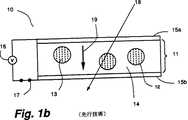 図1aは、Fergason'047に記載のような液晶複合材料から作製した先行技術のライトバルブを示す。ライトバルブ10は液晶複合材料11を含んでなり、この複合材料11において、正の誘電異方性を有するネマチック液晶材料13の滴または塊12はカプセル化材料14内に配置されている。複合材料11は第1電極15aと第2電極15bの間に挟まれており、これらの電極はインジウム錫酸化物(ITO)のような透明導体から作製されている。電源16から電極15aおよび15b間へ電圧をかけたり、かけなかったりするのは、図1では開放位置として示す(オフ状態)スイッチ(開閉器)17で制御されている。その結果、電圧は複合材料11を介して印加されておらず、液晶材料13が受ける電場は実質的にゼロである。表面の相互作用によって、液晶分子は好適にはその長手軸方向に、カプセル化材料14との湾曲境界面に沿って存在して、各滴内においてほぼ曲線状に配列される。この特定の具体例において、カプセル化材料14はまたマトリックスとして作用して、液晶材料13の滴12を含む。異なる滴12の曲線軸は、種々の方向の曲線パターンによって図示されているように、不規則な方向に向いている。液晶材料13は、カプセル化材料14の屈折率npとは異なる異常光屈折率(複屈折率)neを有すると共に、npと実質的に同じ通常光屈折率n0を有する(ここでは、2つの指数または屈折率の差が0.05未満、好適には0.02未満であれば、それらは実質的に同じであまたは整合していると言われている)。複合材料11内を通過する入射光線18は、活動的に相互作用する液晶の屈折率がneであるような液晶材料13とカプセル化材料14との間に存在する少なくとも1つの境界面に達する統計上の可能性が高い。neはnpと異なるため、前方および後方の両方において光線18の屈折や散乱が生じ、複合材料を透明にしたり、非透明(白色)の外観にする(frosty appearance)。