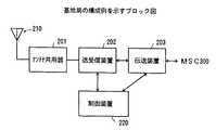 図3において、各基地局200は、送受信共用のアンテナ210が接続されるアンテナ共用器201、送受信装置202、伝送装置203及び制御装置220を有している。送受信装置202は、アンテナ共用器201及びアンテナ210を介して移動機100と信号(音声信号、データ信号、制御信号)の送受信を行う。伝送装置203は、送受信装置202にて受信した信号を交換局(MSC)300に伝送し、交換局(MSC)300から入力した送信すべき信号を送受信装置202に供給する。制御装置220は、送受信装置202及び伝送装置202を制御し、送受信装置202にて受信した信号の処理を行うと共に、送信すべき信号(制御信号、データ信号)を送受信装置202に供給する。