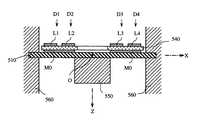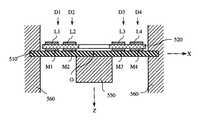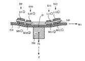 (4)  ピエゾ抵抗素子を利用した機構:コリオリ力の作用により撓みが生じるような基板を設けておく。この基板上にピエゾ抵抗素子を形成しておき、基板に生じた撓みをピエゾ抵抗素子の抵抗値の変化として検出する。すなわち、抵抗値の変化を測定することにより、作用したコリオリ力を検出する。