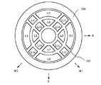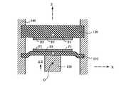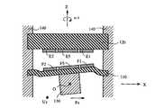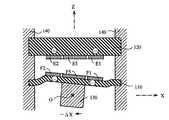 第6図は、この第1の実施例に係る多軸角速度センサの側断面図である。可撓基板110および固定基板120は、いずれも円盤状の基板であり、所定の間隔を保って互いに平行に配置されている。可撓基板110の下面には、円柱状の振動子130が固着されている。また、可撓基板110の外周部分および固定基板120の外周部分は、いずれもセンサ筐体140によって支持されている。固定基板120の下面には、5枚の上部電極層E1〜E5(第6図には、その一部だけが示されている)が形成され、同様に可撓基板110の上面には、5枚の下部電極層F1〜F5(やはり、その一部だけが示されている)が形成されている。ここで、固定基板120は十分な剛性をもち、撓みを生じることはないが、可撓基板110は可撓性をもち、いわゆるダイヤフラムとして機能する。振動子130は、安定した振動を生じるのに十分な重量をもった材質で構成されており、ここでは、説明の便宜上、この振動子130の重心位置Oを原点としたXYZ三次元座標系を考えることにする。すなわち、図の右方向にX軸、上方向にZ軸、そして紙面に垂直な方向にY軸を定義する。第6図は、このセンサをXZ平面で切った断面図ということになる。なお、この実施例では、可撓基板110および固定基板120は、いずれも絶縁性の材料によって構成されている。これらの基板を金属などの導電性の材料で構成したい場合には、絶縁膜を介して各電極層の形成を行い、電極層同士が短絡しないようにすればよい。