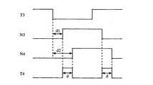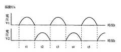 結局、振動子130についてX軸方向の振動Uxを起こさせるには、第12図に示すような波形をもった電圧V1を電極層E1,F1間に供給するとともに、電圧V2を電極層E2,F2間に供給すればよい。このような波形の電圧を供給すれば、期間t1,t3,t5において振動子130には第9図に示すような変位ΔXが生じ、期間t2,t4において振動子130には第10図に示すような変位−ΔXが生じることになる。同様に、振動子130についてY軸方向の振動Uyを起こさせるには、第13図に示すような波形をもった電圧V3を電極層E3,F3間に供給するとともに、電圧V4を電極層E4,F4間に供給すればよい。また、振動子130についてZ軸方向の振動Uzを起こさせるには、第14図に示すような波形をもった電圧V5を電極層E5,F5間に供給すればよい。このような波形の電圧V5を供給すれば、期間t1,t3,t5において振動子130には第11図に示すような変位ΔZが生じ、期間t2,t4において振動子130は、可撓基板110の復元力により第6図に示す位置に復帰する(このとき、慣性力に応じた変位−ΔZが発生する)。