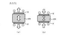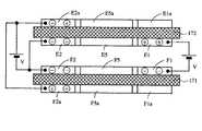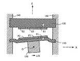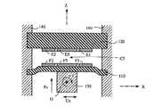 今度は、電極層E2,F2間に所定の電圧を印加した場合を考える。たとえば、第10図に示すように、電極層E2側が正、F2側が負となるように電圧を供給すると、これらの間に吸引力が作用し、電極層E2,F2間の距離が縮まるように可撓基板110は機械的に変形する。この結果、振動子130はX軸の負の方向にΔXだけ変位を生じることになる。結局、電極層E1,F1間に電圧を印加すれば、振動子130はX軸の正の方向に変位し、電極層E2,F2間に電圧を印加すれば、振動子130はX軸の負の方向に変位することになる。したがって、電極層E1,F1間への電圧印加と、電極層E2,F2間への電圧印加と、を交互に行えば、振動子130をX軸方向に往復運動させることができる。