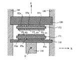 続いて、電極層E5,F5間に所定の電圧を印加した場合を考える。たとえば、第11図に示すように、電極層E5側が正、F5側が負となるように電圧を供給すると、これらの間に吸引力が作用し、電極層E5,F5間の距離が縮まるように可撓基板110は機械的に変形する。電極層E5,F5はいずれも各基板の中央に位置するため、可撓基板110は傾くことなく、Z軸方向へ平行移動するような変位を生じることになる。この結果、振動子130はZ軸の正の方向にΔZだけ変位を生じることになる。両電極層E5,F5への電圧印加をやめれば、振動子130はもとの位置(第6図に示す位置)へ復帰する。したがって、両電極層E5,F5への電圧印加を断続的に行えば、振動子130をZ軸方向に往復運動させることができる。