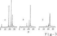 図3は、実験1による生成物のイオン交換高速液体クロマトグラフィー(IEHLPC)の結果を示す。ここで、A、0℃で溶液中2時間後;B、0℃で2日後;C、溶液を凍結し−18℃で5日間貯蔵した最終工程後であり、ピークは約17分、21分、及び24分で、それぞれ化合物1、化合物2、及び化合物3に対応する。