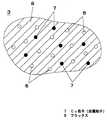 ここで、鉛フリー半田ペースト3について説明する。鉛フリー半田ペースト3は鉛成分をほとんど含まない半田ペーストであって、図2の模式図に示すように少なくとも錫/亜鉛(Sn/Zn)を含む半田粒子6と銅(Cu)をベースとする金属粒子7とをフラックス8に混合することによりペースト状にしたものである。この錫・亜鉛系の半田ペーストは、従来の錫・鉛系の半田と同様に融点が低いことから、基板1や電子部品4の焼損を招くことなく半田接合が行えるという長所を有している。ここに示す例では、銅(Cu)をベースとする金属粒子7を、重量比で3〜30%の範囲で含有させている。