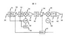 次に、放送受信及びデータ通信端末3内のチューナ25からダウンコンバータ27までの実施の形態について図3、図4で説明する。図3はチューナ25にいわゆるシングルスーパー方式を用いた場合である。同図において、50は入力端子、51は入力同調フィルタ、52、58は可変利得増幅器、37はAGC電圧設定回路、53は段間同調フィルタ、54、59は周波数変換器、55、60は局部発振器、56、62は増幅器、26は帯域通過フィルタ、61は低域通過フィルタ、63は出力端子、64はPLL(Phase  Locked  Loop)回路である。