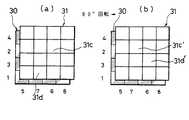 前記、階層化されるマス基盤31の回転モードが選択された場合、前記図12に示すスタート位置〔図13(a)参照〕から、反時計方向に90°回転させると、二符号保持片31c,31dの位置が、図13(b)に示すようにそれぞれ31c′,31d′に移動する。この移動に基づいて新たなコードが設定される。すなわち、この移動した二符号保持片31c′と垂直方向に重なる位置にあるベースマス基盤30の二符号保持片30c′(図10参照)のX軸とY軸位置の桁符号は、前記のように黒色の区域符号を優先に記述すると「72」となる。また、移動した二符号保持片31d′と垂直方向に重なる位置にあるベースマス基盤30の二符号保持片30d′(図10参照)のX軸とY軸位置の桁符号は、前記のように黒色の区域符号を優先に記述すると「36」となる。したがって、マス基盤31が90°回転すると「7236」という新たなコードが設定される。このように、マス基盤31が90°回転する毎に新たなコードが設定される。この新たにコードが設定される都度、コードファイル101に記録される。