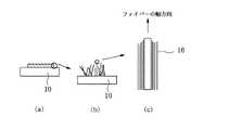 また、本発明においては、第2チャンバ(5)内において、基板(7)をステージ(8)に固定し、ステージ(8)を移動することで、基板上の所望領域に所望量の、炭素を主成分とするファイバーを固定することができる。またさらには、ステージ(8)の移動速度を変化させることで、固定される炭素を主成分とするファイバーの密度を変えることもできる。前記ノズル(6)も可動式であり、ノズル(6)とステージ(8)の相対位置を微調整して、炭素を主成分とするファイバーを緻密に基板上に固定することができる。