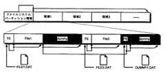 また、使用過程において、例えば図3におけるFILE2.DATが削除された場合、通常はFILE2.DATに対応するFE(File  Entry)とデータが記録されていた箇所はSpace  Bitmap  Descriptorによって未使用な部分であるとし、解放される。しかし本発明では、図に示すように削除された部分は解放せずに、前述したダミーファイルDUMMY1.DATが管理する部分として扱う。この際、DUMMY1.DATのFE(File  Entry)内のAllocation  Descriptorを更新して、DUMMY1.DATが2つの分断から構成されるファイルとする事になる。