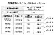 スケジュールイベント情報は、チャンネルごとに例えば番組識別子・番組開始時刻・継続時間・番組情報を持つ番組案内情報が番組開始時刻の早い順に1週間分など一定期間分記述されている。また、1つの単一イベント情報には、1つの番組に対して、チャンネル識別子・番組識別子・番組開始時刻・継続時間・番組情報が記述されている。現在/次イベント情報送出スケジュールは、チャンネルごとに現在/次イベント情報の切り替えスケジュールが記述されている。