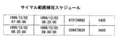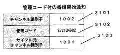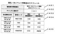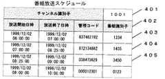 図4に番組放送スケジュールについてその例を示す。番組放送スケジュールは、チャンネル毎に編集され、例えば、図4の番組放送スケジュールは、401によりチャンネル1001に関するスケジュールであることが分かる。番組放送スケジュールには、そのチャンネルに属する番組に対して、402に示すように、例えば放送開始日時、放送開始日時、放送終了日時、管理コード及び番組識別子からなる番組エントリが記述され、それらが放送される順にスケジューリングされている。例えば、この番組放送スケジュールの先頭の番組エントリには、放送開始時刻「1999/12/02  06:00:00」、放送終了日時「1999/12/02  07:00:00」、管理コード「837462152」、番組識別子「1234」が設定されている。