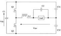 このハーフブリッジインバータでは、インバータ負荷回路に印加される電圧は、インバータへの電源電圧Vdcの半分の電圧しかない。印加される電圧が低いため、必然的に同じ出力を得るには回路電流が大きくなり、したがって、回路損失が大きくなり、回路効率が良くない。また、部品の電流定格を大きくする必要があり、コストの上昇につながる。