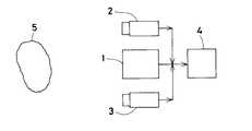 図1に本発明の実施例1の装置の配置図を示す。図中、1は能動的な測定を行うレーザレンズファインダ、2、3はステレオ画像計測を行うための撮像装置、4はデータ処理装置、5は測定対象物体である。