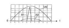 この電流は、電源ラインの高調波負荷の既存または将来的な規制に矛盾する。そのとき電流iN2は、図1の補助電流調節の結果、望ましい動作で電源ラインから出る。電流iN2は、電源ラインの半サイクルの間、長い持続と小さい増幅となり、UNに比例する非常に良い近似に理想波形になる。