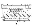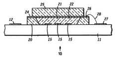 具体的に図1を参照すると、反射型液晶空間光変調器(LCSLM)積層体10の簡略拡大断面図が示されている。積層体10は、シリコン、炭化シリコン、砒化ガリウム等のような、いずれかの都合の良い半導体物質で形成された基板11を含み、この中に集積電子回路を形成することができる。以下で更に詳細に説明するが、集積電子回路は、積層体10内に形成される各LCSLM画素のために、1つの駆動回路と、これと連携するアドレシング(addressing)およびスイッチング回路とを含む。基板11の縁に隣接して複数のボンド即ち端子パッド12が形成され、集積電子回路と電気的に交信することにより、電子回路の個々のアドレシングが可能となる。