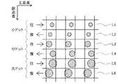 さらに、そのような印刷装置において、それら複数種類のインク滴の吐出タイミングをそれぞれ独立に操作することができず、一体として連動させなければならない場合には、一方のインク滴のズレをなくすようにインク滴吐出タイミングをずらすと、他方の着弾位置のズレがかえって大きくなってしまうことがある。図17(b)は、図17(a)の状態から小インク滴の着弾位置ズレがなくなるように吐出タイミングを補正した場合の印刷結果を示す説明図である。図17(b)では、中ドットのズレは補正前よりもかえって大きくなっている。一方、中インク滴を基準として吐出タイミングを調整した場合も、同様に小ドットの位置ズレが大きくなってしまう。