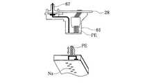図4は、ピエゾ素子PEとノズルNzとの構造を詳細に示した説明図である。キャリッジ31下部に設けられた各色のヘッド61ないし66には、各ノズル毎に、電歪素子の一つであって応答性に優れたピエゾ素子PEが配置されている。そして、図4上段に図示するように、ピエゾ素子PEは、ノズルNzまでインクを導くインク通路68に接する位置に設置されている。ピエゾ素子PEは、周知のように、電圧の印加により結晶構造が歪み、極めて高速に電気−機械エネルギの変換を行う素子である。本実施例では、ピエゾ素子PEの両端に設けられた電極間に所定時間幅の電圧を印加することにより、図4下段に示すように、ピエゾ素子PEが電圧の印加時間だけ伸張し、インク通路68の一側壁を変形させる。この結果、インク通路68の体積はピエゾ素子PEの伸張に応じて収縮し、この収縮分に相当するインクが、粒子Ipとなって、ノズルNzの先端から高速に吐出される。このインク粒子Ipがプラテン26に装着された用紙Pに染み込むことにより、印刷が行われる。