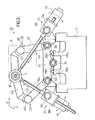 支持アーム18、20は、スライドテーブル14に固定された軸受38、40に一端部が軸支された第1アーム42、44と、前記第1アーム42、44の他端部に固定された軸受46、48に一端部が軸支された第2アーム50、52とから構成されており、前記第2アーム50、52の他端部にスピンドルユニット16が連結される。なお、第2アーム50、52は、軸受46、48を中心として回動した際に第1アーム42、44に干渉することを最大限回避させるため、その中間部分が前記第1アーム42、44から離間する方向に屈曲している。