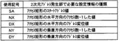 図3は、前記DMA設定保持部106に保持する2次元アドレス発生部107の設定情報を示すものである。図3において、SAはアクセス矩形領域のスタートアドレスを有効画像データ領域内にした時のアドレス値、NXは前記アクセス矩形領域の水平方向のアクセス数から1を引いた値、DXは前記アクセス矩形領域の水平方向のアドレス変位値、NYは前記アクセス矩形領域の垂直方向のアクセス数から1を引いた値、DYは前記アクセス矩形領域の垂直方向のアドレス変位値である。